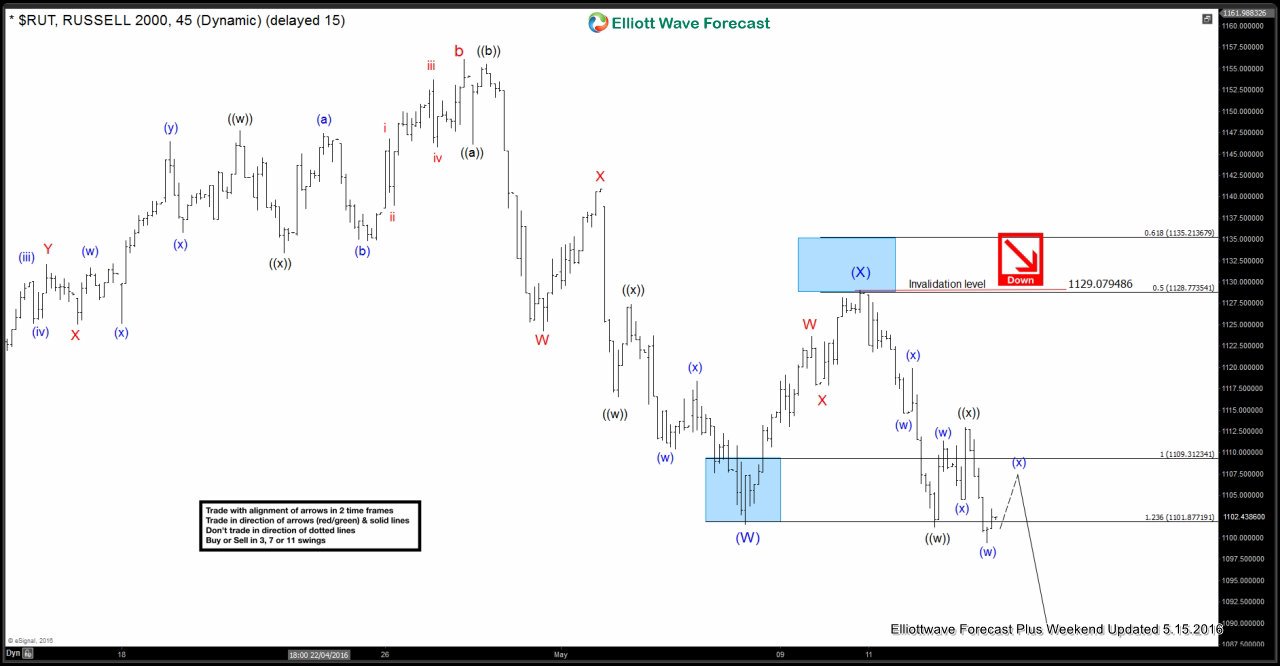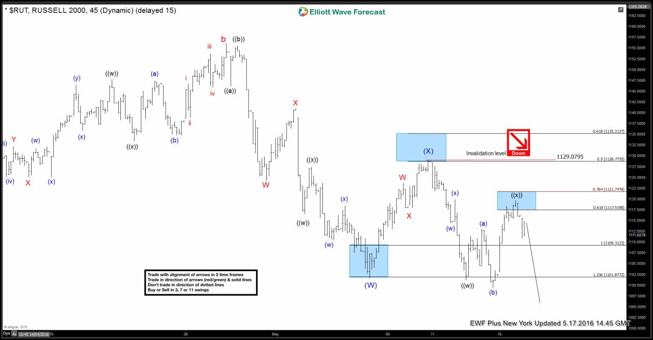 1 hour weekend chart of Russell 2000 on 5/15 above is showing that Index should continue lower after a bounce in wave (x). As the Index shows a sequence of lower low, wave (x) bounce is expected to fail below wave ((x)) at 1112.96 for continuation lower. In the next two days, the Index instead rallied and broke above wave ((x)) or above 1112.96. Let’s take a look at 1 hour chart of Russell 2000 on 5/17 below:
