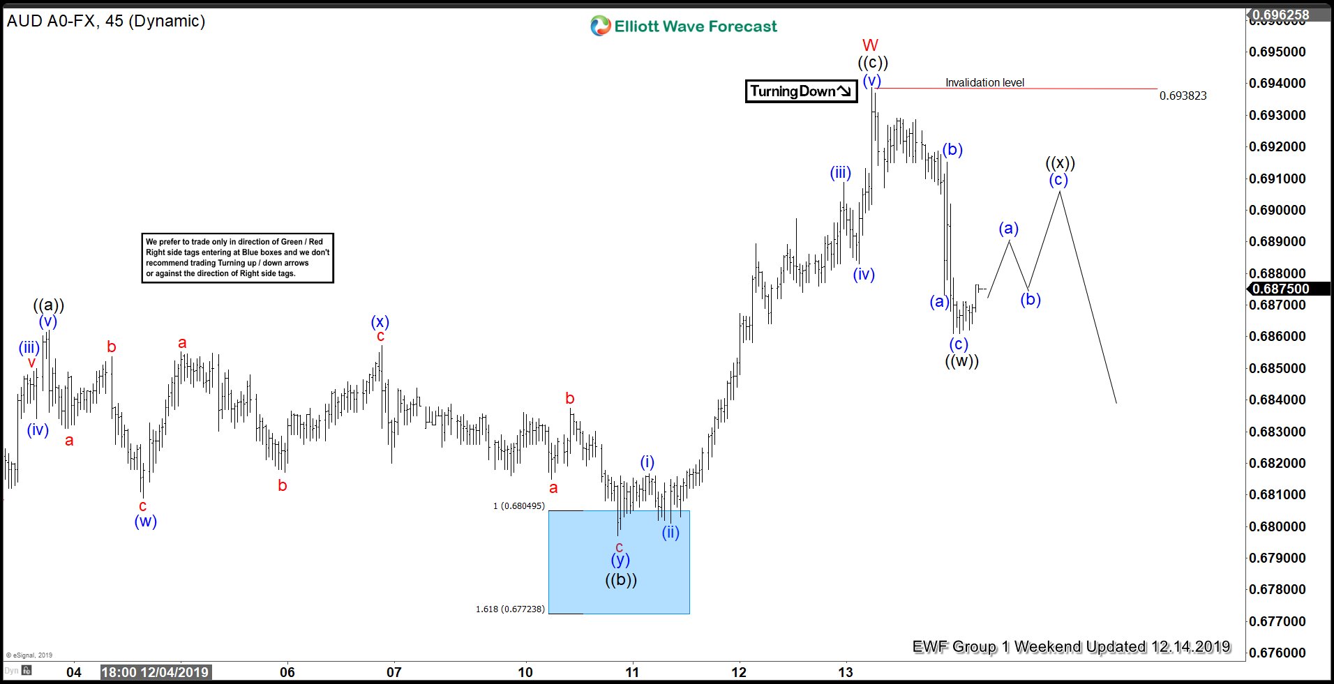 AUDUSD found buyers right at the blue box area . We got nice impulsive rally when the price made break above 10/31 peak. That suggests further extension higher as far as pivot at 0.67523 low holds. At this stage we are calling cycle from the 11/29 low completed as wave W red. As far as the price stays below 0.693823 peak, we can get another leg down before buyers appear again.