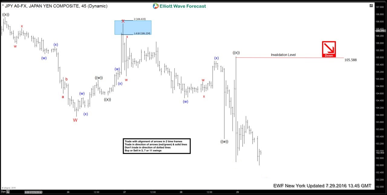 The Charts from 7/29 Asia updated is suggesting 3 swings down from the 7/21 peak (107.49) is labeled as ((w))-((x))-((y)) within wave W in red ended at 103.98 low & then pair ended the bounce in 3 swings labelled as ((w))-((x))-((y)) within X at 106.55. We can see that before BOJ announcement hit the wires, pair had broken below 103.98 (red W) low and was showing 5 swings down from 7/21 peak @ 107.49. We know 5 swings is an incomplete sequence and unless pair turned into a FLAT from 103.98 low, the next bounce should turn out to be an ((x)) wave and fail below 106.55 high for another push to the downside. After BOJ news hit the wires, pair made a push higher as shown on the chart to offer a short-term selling opportunity against 106.55 high and then made new lows to complete a 7 swing sequence down from 7.21.2016 peak.
