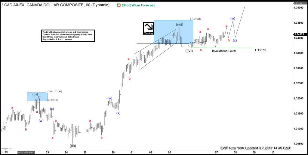 The proposed pullback in Minutte wave (x) ended at 1.3051 low, while above there & more importantly above 1.3006 low, pair was expected to resume higher towards (1.3256-1.3306) 100%-123.6% fib ext area of first 3 swings to end the cycle from January 31 low. But then, pair exceeded the 1.618% Fibonacci extension area (1.3382) area & move from 1.3051 looks extended thus favoring the idea of 5 swings up from 1.3070 (2/16) low at least and possible become a FLAT from 1/31 low (1.2965). Area between 1.3382-1.3460 was expected to end wave ((iii) before pair pulled back in wave ((iv)) to correct the cycle from 1.3051 low and turned higher again in wave ((v)) of C as the updated chart from March 3 2017 below is showing.