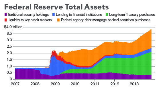 Quantitative easing mainly known as “QE program” was the biggest emergency economic stimulus in the history. The U.S. Federal Reserve’s once-in-a-lifetime program to buy immense piles of bonds, month after month, in an extraordinary effort to restart a recession-deadened economy came to an end in October 2014 after adding more than $3.5 trillion to the Fed’s balance sheet, an amount roughly equal to the size of the German economy. The bond-buying program, called quantitative easing or QE, had been controversial since its start in 2009, as had the Fed’s decision in 2013 to gradually reduce the monthly economic boost, a plan that became known as the taper. Whether the Fed tapered too soon, given global economic weakness, or too late, given signs of bubbles in some markets, was hotly debated. But even after the taper’s end the Fed continued to pump support into the economy the old-fashioned way, by holding its interest rates near zero for about up till by the end of 2015. Below is the Federal Reserve Total Assets Chart: