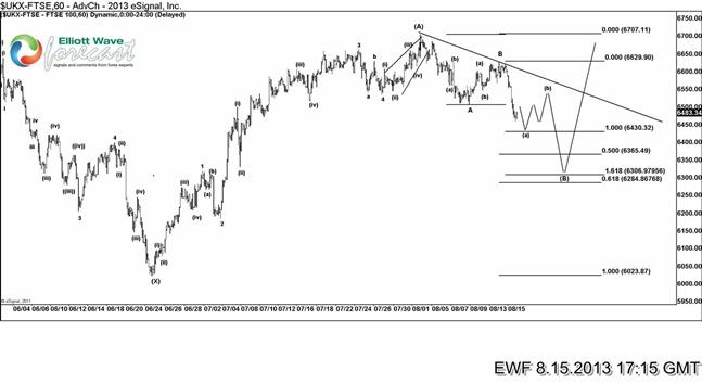 It’s time to revisit $FTSE chart as we last looked at it on 8.1.2013 and establish that bulls had regain control as Index showed a 5 wave move up following a 5 wave decline which is a bullish setup. We expected Index to find resistance around 6743 and turn lower in 3 waves to complete a 5-5-3 bullish setup. Index formed a peak @ 6707 on the day our last article was published and started turning lower.