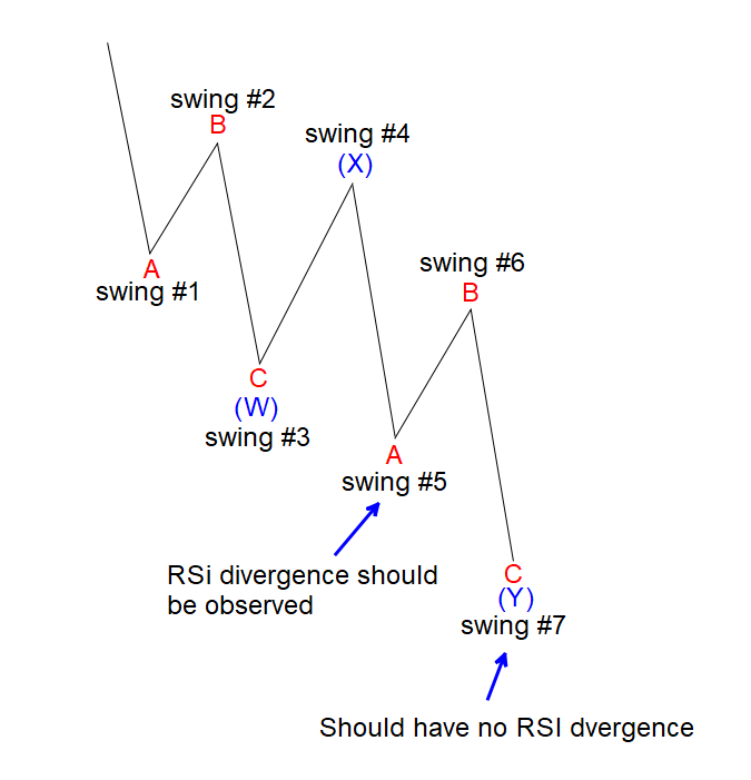 As the graph above shows, when the structure forms a 5 swing lower, swing #5 should come with momentum divergence. In other words, at that point, price makes lower low, but RSI makes a higher low. In the traditional interpretation, a momentum divergence like this signals it’s bullish. Even though it’s partially true that we expect instrument to rally in swing #6, but the fact there’s a divergence in swing #5 suggests the prevailing trend is not complete yet to the downside. Thus instead of trying to buy the divergence, it’ll be better to sell the rally as the prevailing trend in this case is to the downside to end 7 swing structure. Every corrective structure, whether it’s a 3 swing ABC, or 7 swing WXY, per guideline, normally ends without a divergence.