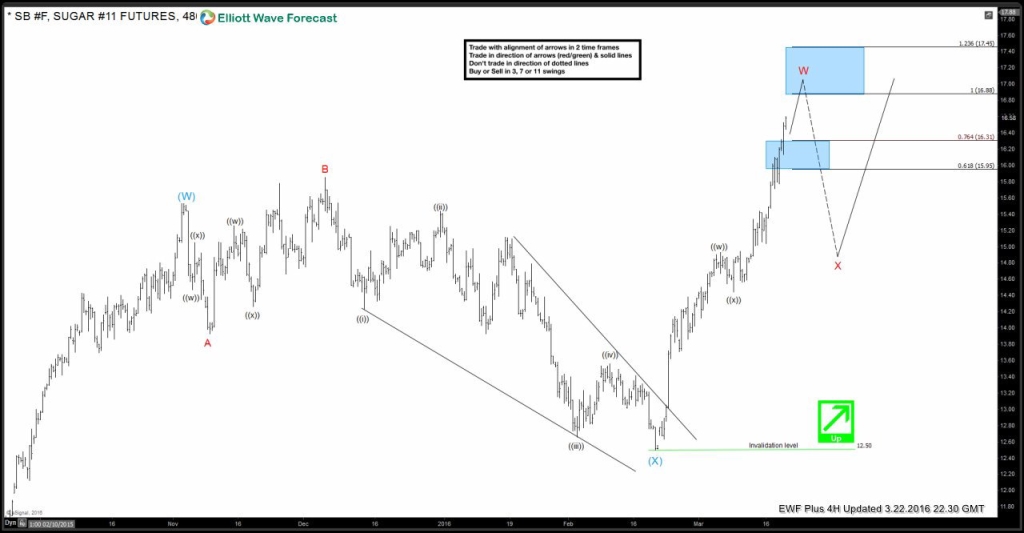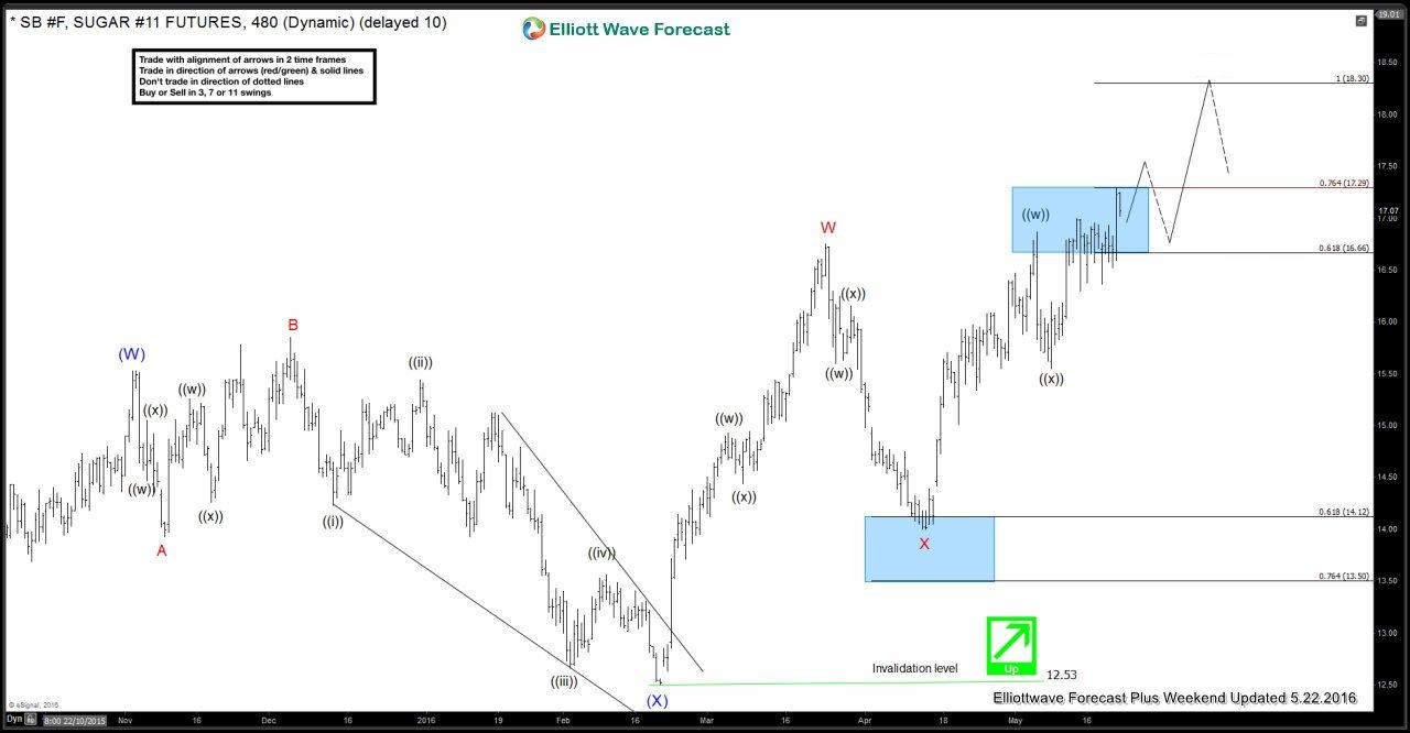 Since then Market did a pullback nicely from above mentioned blue box area and reached the buying areas within wave X in red pullback and then turned higher again to make new highs. Let’s take a look at the recent 4 hour chart of Sugar.