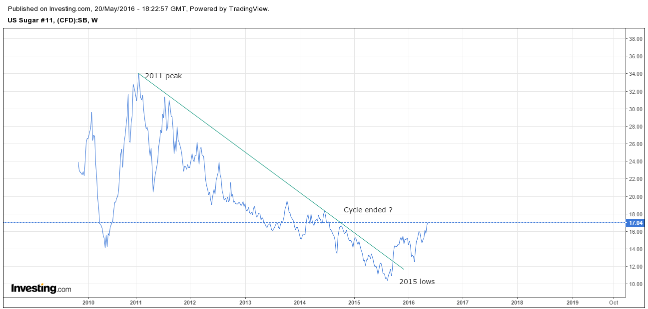 The International Sugar Organization (ISO), assuming average growth in global Sugar demand, forecasts a looming world production deficit of more than 6 million tones over the next two seasons. It also forecasts a 2.3 million tones shortfall in 2015-2016. This is the first shortfall in six years. Sugar, driven more by the invisible hand following deflationary forces than the ISO forecasts, has been mired in a bear market despite production deficits since 2011. Given that Chart above is showing the drawdown of Production & Rising demand of consumption given that is it the right time for prices to rebound?? Well let’s take a look at the weekly chart where price is trading outside the channel for first time since 2011.