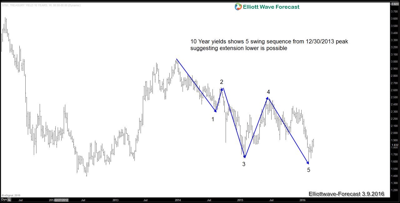 2) The break below 1.65% in 10 year yields confirm the high risk aversion of market participants. Furthermore, the 5 swing sequence in 10 year yields from Dec 2013 peak suggest continuation lower is possible as chart below shows