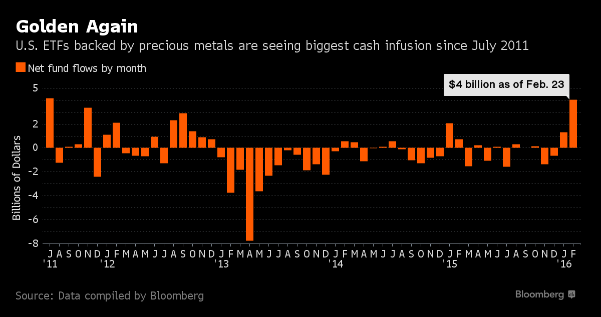 All the factors and development above have created the biggest inflows in Gold’s ETF since July 2011 as the chart below from Bloomberg shows
