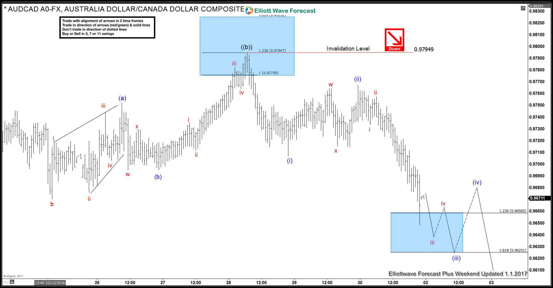 AUDCAD Pair reacted lower from our red box area (0.9775-0.9824) & broke below previous low as expected, as can be shown below 1 hour 1.1.2017 weekend updated chart, thus allowed our members to create a risk free position in the trade.