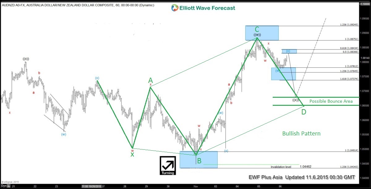 AUDNZD has been moving lower since August 24/2015 and it’s possible that the pair has found a temporary bottom at the 1.0446 October 30 low. The pair has since bounced and on November 3/2015 it made a rally to break above the trend line which can possibly be signalling that more Aussie strength against the Kiwi will be coming in the following days and weeks. Any pullbacks now can find buyers possibly waiting at the 1.0688 – 1.0648 area to trade it higher. Also there is a bullish pattern on the 1 hour chart that coincides where our projected Elliott Wave ((x)) can possibly terminate which coincidentally is also at the 0.50% Fibonacci retracement of the October 30 rally. The 1.0688 – 1.0648 area is where the green bullish pattern triggers for the BUY and both the Elliott Wave count and green bullish pattern is invalidated if price gets below 1.0446. If it reverses higher from the Possible Bounce Area look for AUDNZD to make another swing higher targeting the 1.0965 – 1.1030 area.