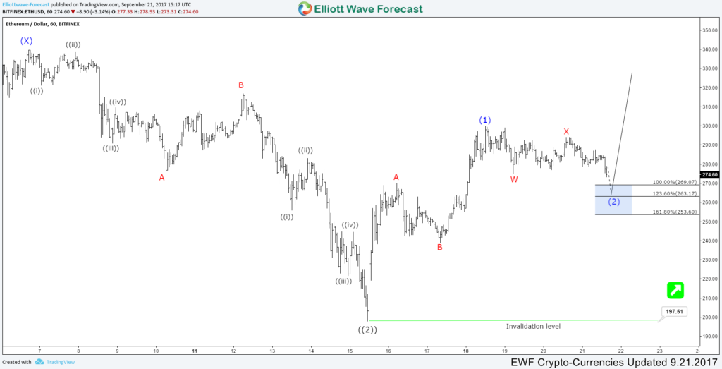 The leading cryptocurrencies BTCUSD & ETHUSD rallied up from 09/15 low in a 3 waves Zigzag structure which ended wave (1) as part of an expected 5 waves diagonal to the upside. Both instruments is now doing a short term pullback in wave (2) as a double three toward equal legs area ($3740 – $3549 for bitcoin) and ($269 – $253 for Ethereum) where it should resume higher or bounce in 3 waves at least.