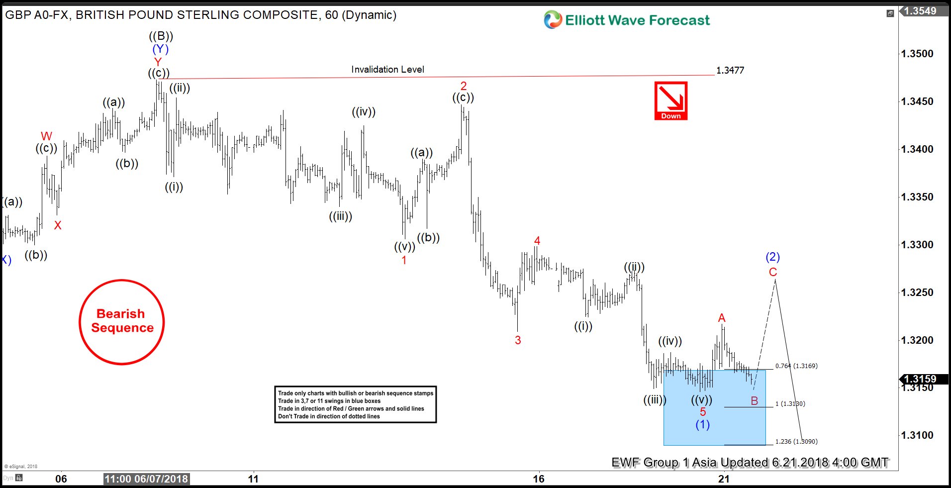 GBPUSD short-term Elliott Wave view suggests that the recovery to 1.3473 on 6/07/2018 peak ended primary wave ((B)) bounce as double three structure. Below from there, the pair has managed to break below the previous low on 5/29 (1.3203) to confirm the next extension lower in primary wave ((C)) has started. With this break lower, the sequence from 4/17/2018 peak has become incomplete to the downside.