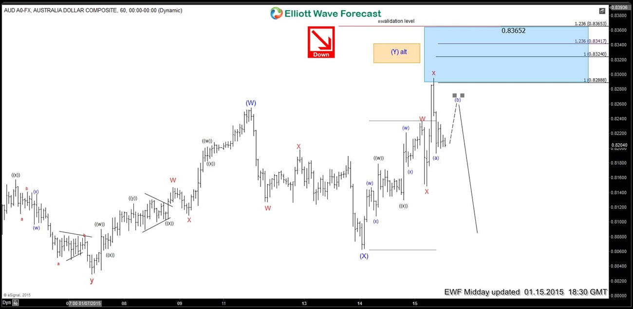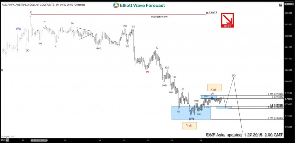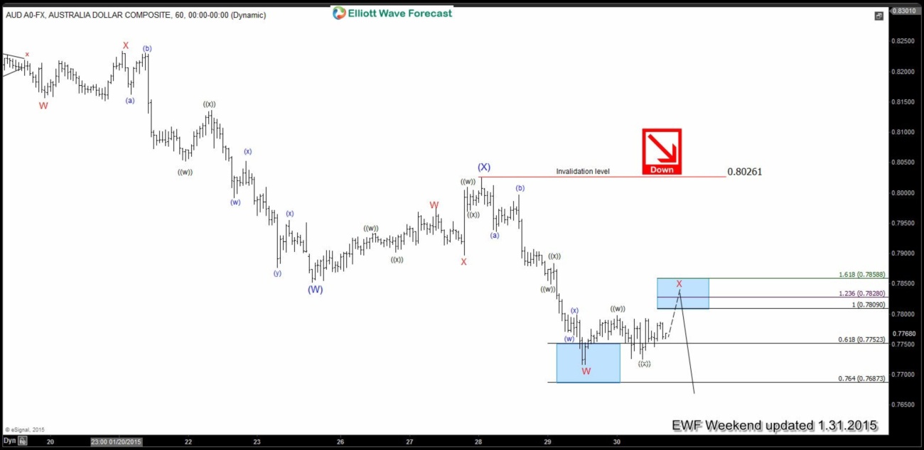 AUDUSD 1H January 31/2015 : After wave (X) bounced and hit the equal legs area at 0.8015 it reversed and continued to move lower to the next level of interest as we expected. Move lower is now approximately 500 pips from first and second selling area and approximately 300 pips from the third selling area. Arrow pointing down, invalidation level moved lower to 0.8026 and the fourth selling opportunity presents itself. We advised our members to look to sell on the red wave X in the 0.7809 – 0.7858 area against 0.8026 invalidation level.