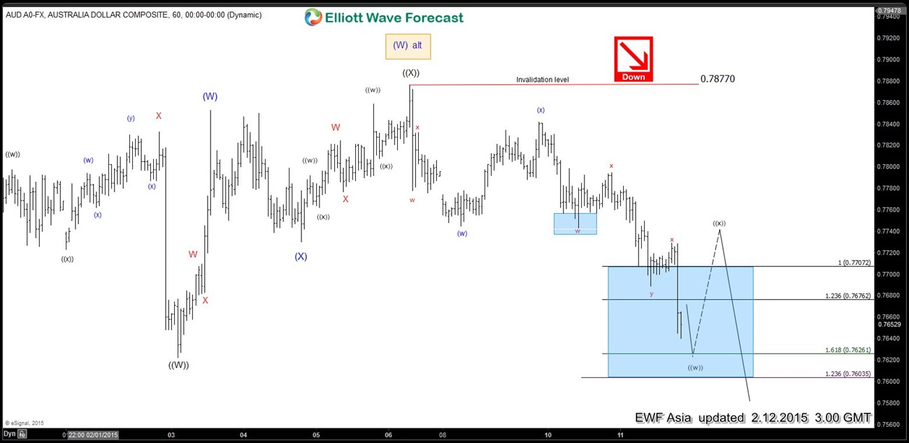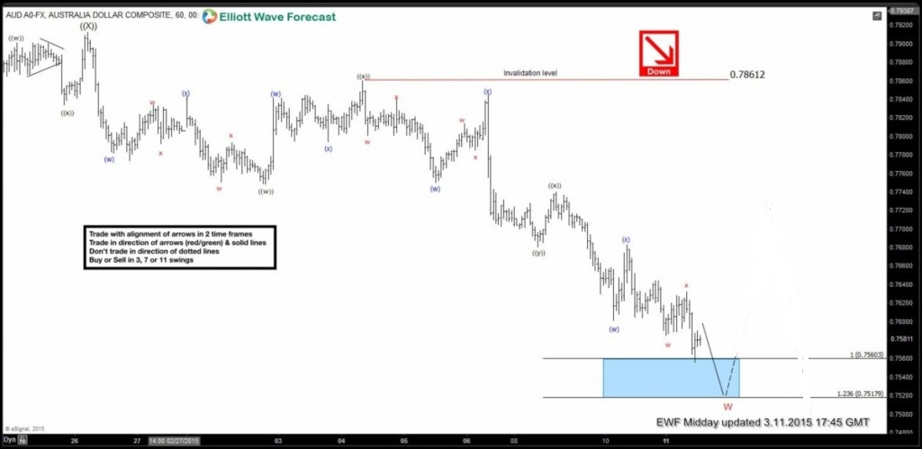 Since 2011 AUDUSD is on a corrective WXYZ Elliott Wave structure on the weekly chart. On the bigger time frames (Weekly, Daily and 4h) AUDUSD has been moving on a clear down trend. So to enter a trade you must ask yourself, which side would you trade this pair. Would you BUY or SELL it? We at Elliottwave-Forecast always advise our members to trade with the trend and not against it. As you will see below our charts clearly shows our members to look to sell the Aussie dollar and to continue to trade only on the right side. The trend side.