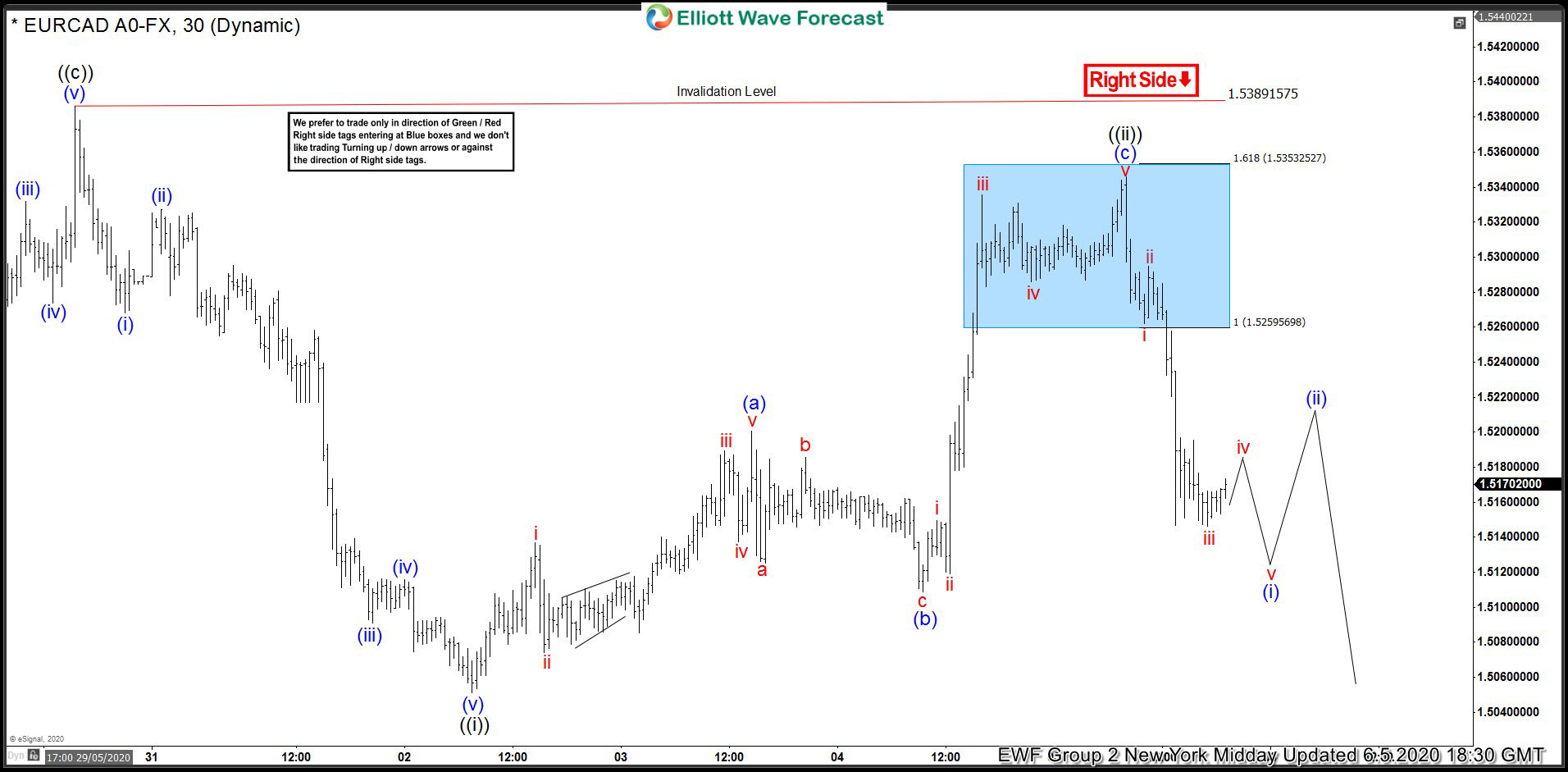 EURCAD is correcting the cycle from the 1.5387 peak. Recovery looks incomplete at the moment, as we got 5 waves up from the lows. Suggesting we have ended only first leg of potential Elliott Wave Zig Zag Pattern . Consequently we are calling for 3 waves pull back in (b) blue and another leg up (c) which should be made out of 5 waves.We don’t recommend buying the pair and favor the short side from higher levels once ((ii)) recovery reaches its extremes. ( blue box)