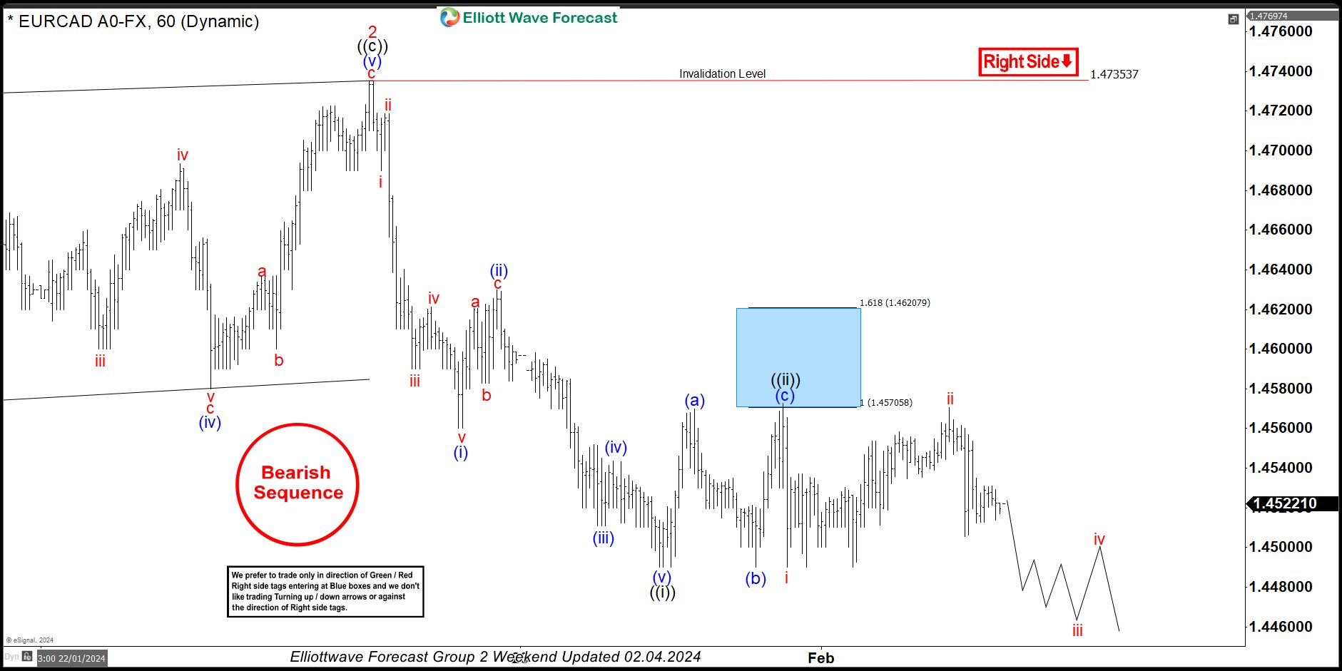 EURCAD 1-Hour Elliott Wave Chart from 1/31/2024 London update. In which the decline to 1.4490 low ended wave ((i)) as an impulse sequence. Up from there, the pair made a bounce in wave ((ii)). The internals of that bounce unfolded as a zigzag structure where lesser degree wave (a) ended at 1.4569 high. Wave (b) pullback ended at 1.4490 low and wave (c) managed to reach the blue box area towards 1.4570- 1.4619 area. From there, sellers were expected to appear looking for further downside or a minimum 3-wave reaction lower.