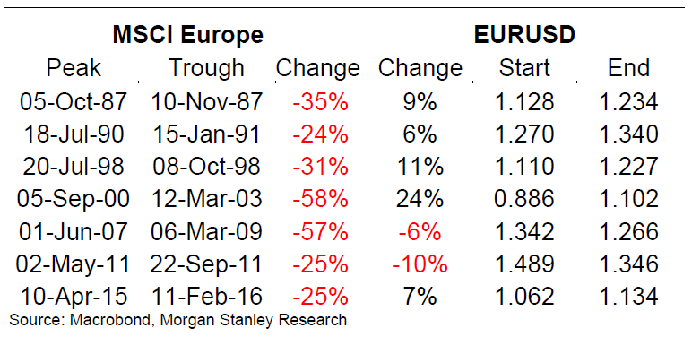 In our previous Jan 19 article “Where is Euro going next“, we explain the negative correlation between asset volatility and the Euro. When stock market declines, the Euro dollar goes up, and vice versa. The table below from Morgan Stanley confirms this inverse relationship. We can see that other than the period between 2007 – 2009 and the period in 2011, this negative correlation between the Euro and risky assets remains true.