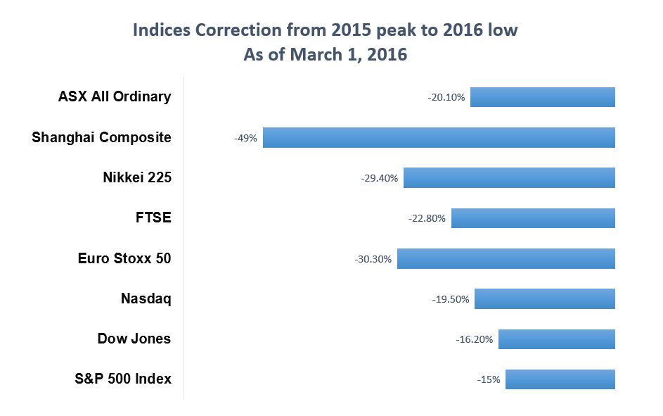 Since the peak in 2015, global indices have corrected in double digit figure. Below is global indices correction from 2015 peak to 2016 low as of March 1, 2016