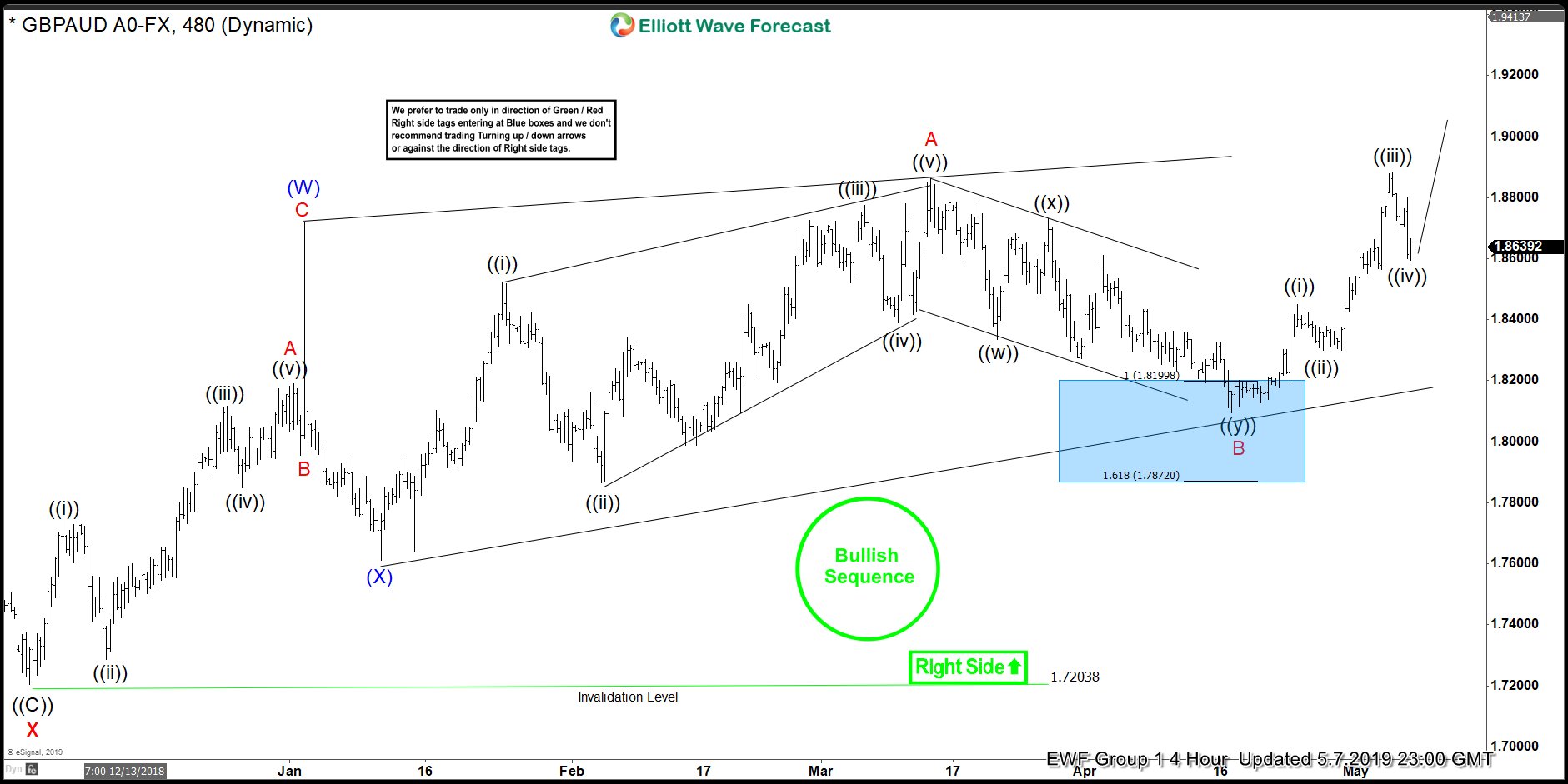GBPAUD ended the cycle from 01/11/19 low in blue wave (3) at 03/14/19 peak (1.88562). Below from there, we expected a pullback to occur in blue wave (4). The pullback unfolded in an Elliott Wave Double Three correction structure. We advised members that GBPAUD should continue higher and that we wanted to buy the pair. Therefore, we expected buyers to appear in the sequences of 3, 7 or 11 swings. At the 100 – 1.618 Fibonacci extension of red W-X which came at around 1.81998-1.78720 area and that was the first area for us to buy with a potential stop loss below 1.78720 level.