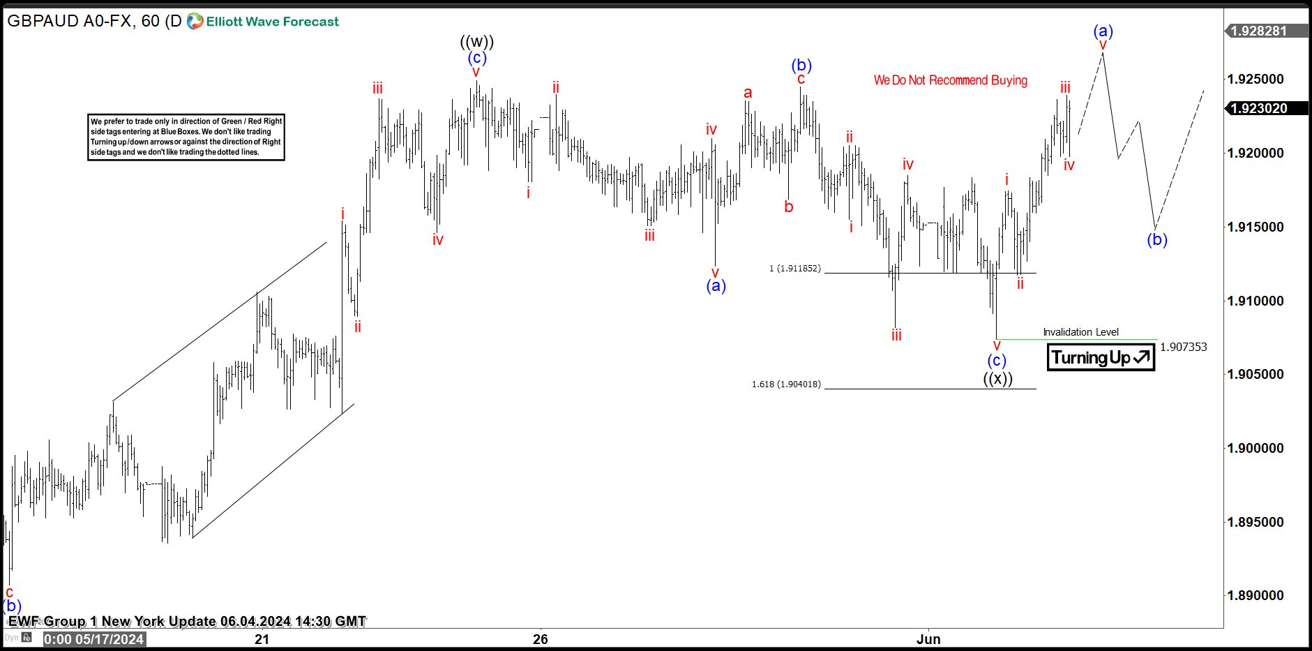 Here’s the 1-hour Elliott wave Chart from the 6.03.2024 NY update. In which, rally to 1.9249 high ended the wave ((w)) & made a pullback in wave ((x)). The internals of that pullback unfolded as Elliott wave zigzag structure where wave (a) ended at 1.9123 low. A bounce to 1.9245 high ended wave (b) bounce. Then the pair started the next leg lower in wave (c) towards 1.9118- 1.9040 equal legs area. From there, buyers were expected to appear looking for new highs ideally or for a 3-wave bounce minimum.