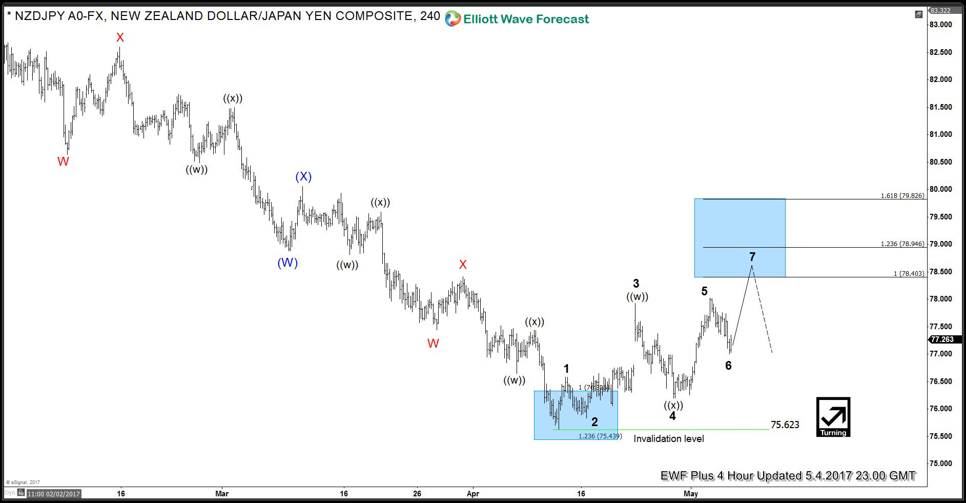The chart below is NZD JPY 4 hour update from 05.04.2017. As our members know, we were pointing out that NZDJPY is having incomplete bullish swings sequnces from the 75.62 low. Structure has been calling for more strength in 7th swing toward 78.40-78.94 ( taking profit area). Once the pair reaches proposed area in 7 swings, we expect to see 3 wave pull back to correct the cycle from the lows.