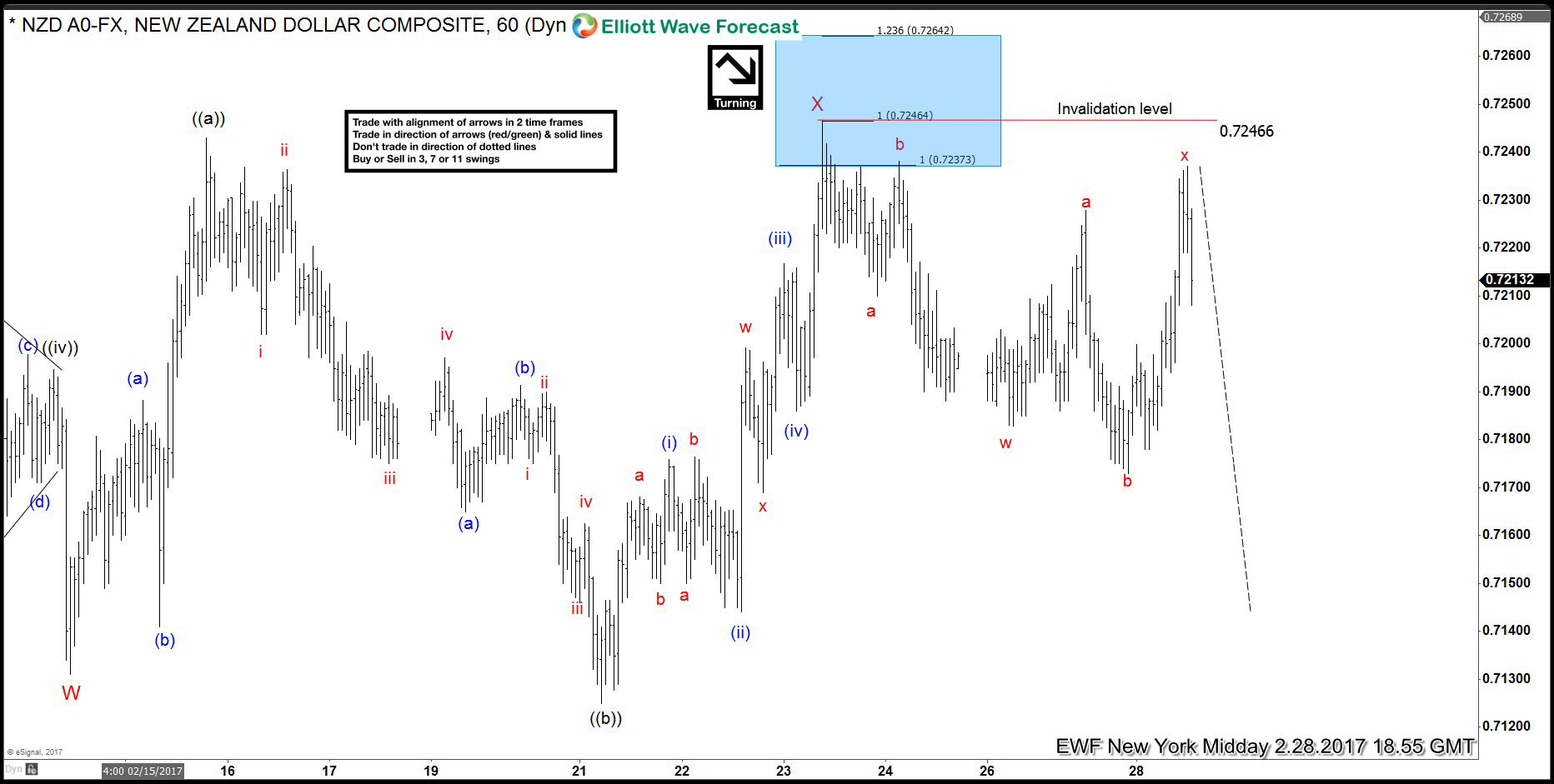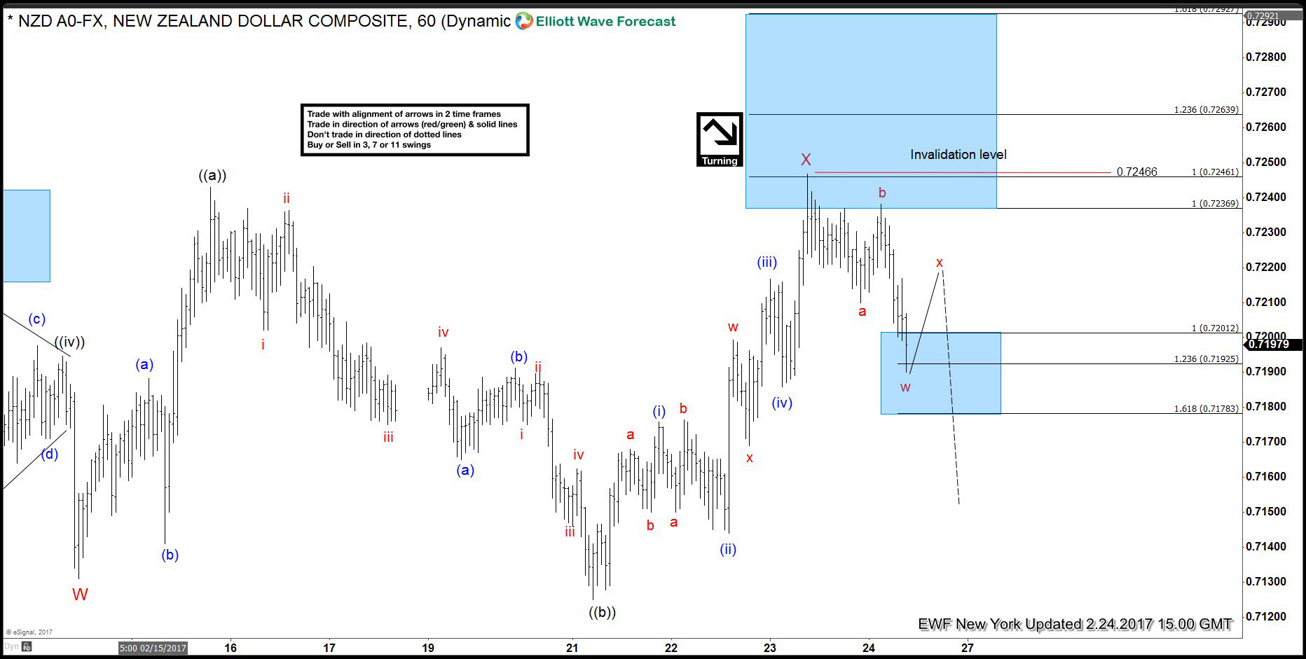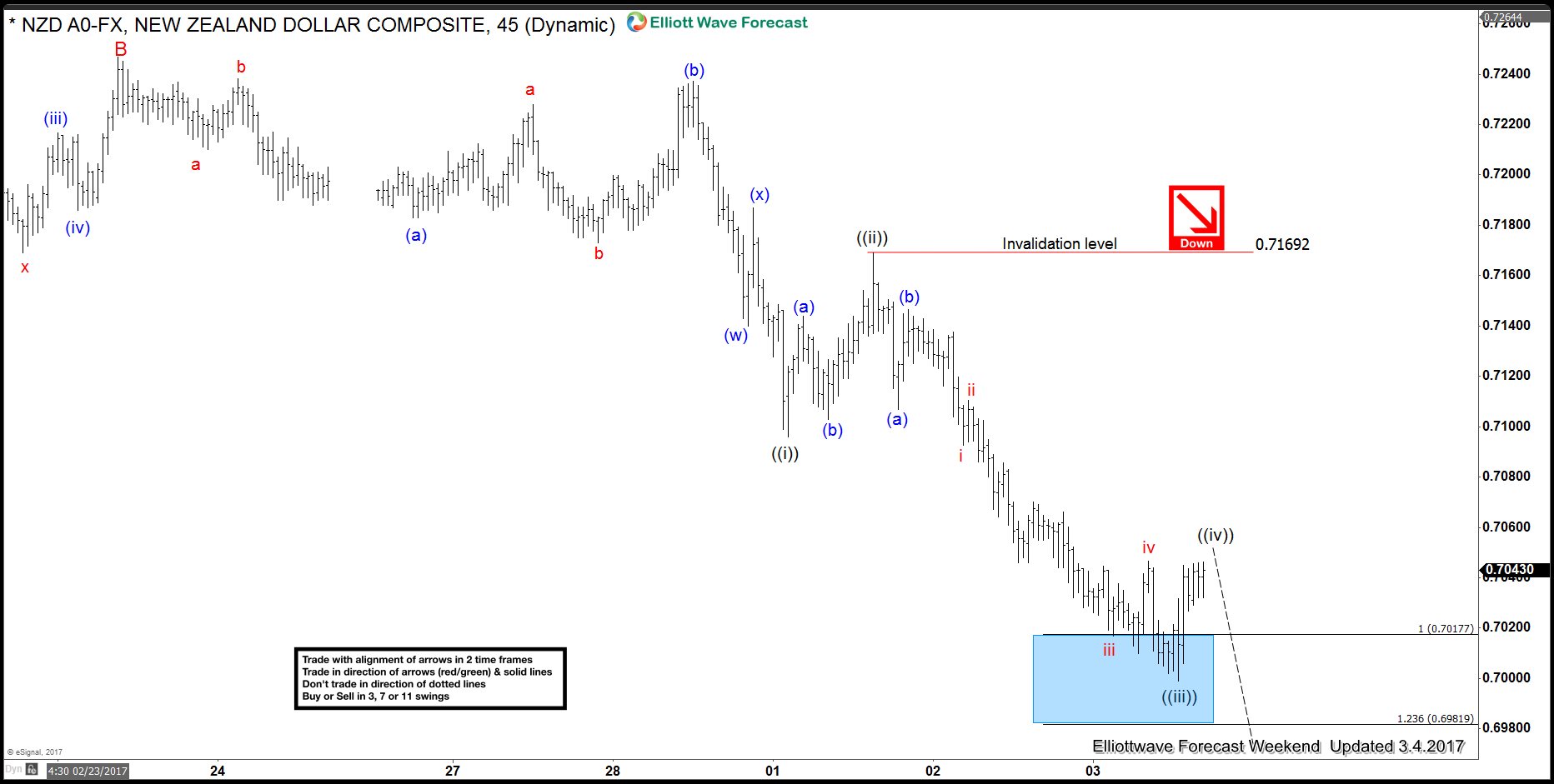 The chart below is $NZDUSD 4 hour chart from 02.28.2017. Our analysis suggests the price is correcting the cycle from the 0.6854 low. First leg W red has ended on 02/14 as expanded flat. On 02/21 date we got lower low: wave ((b)), and we got bearish sequences from the peak. In a mean time short term structure got little bit tricky. X red connector turned into irregular Flat correction. Our Elliott Wave analysis suggests X red is done at 0.7246 high. Consequently, the pair is ideally within Y red leg, looking for more downside, targeting 0.70044-0.69469 area.