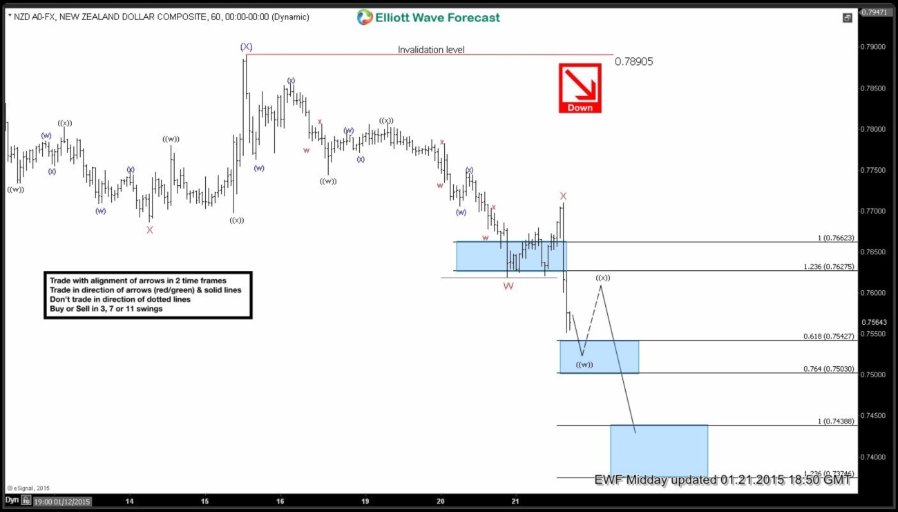 Pair remains bearish while below 0.7891 & now the X high at 0.7710. We expect wave (( w )) of Y to end in 0.7542 -0.7503 area followed by a bounce in wave (( x )) and then lower again toward 0.7438 – 0.7374 area to complete 7 swings down from 0.7891 high. After that there should be another 3 wave bounce in the pair. We don’t like buying the pair and like another extension lower after (( x )) wave bounce as far as short-term pivot at 0.7710 high remains intact.