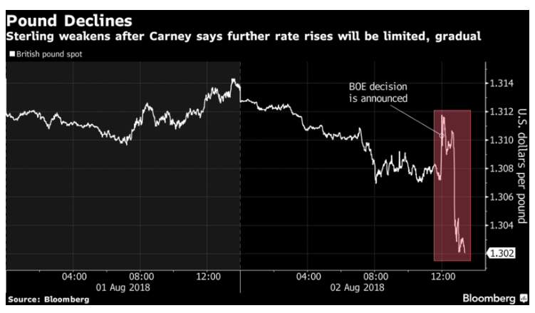 Governor Mark Carney however gave no indication of the need to accelerate the rate hike. Carney said that further rate rises will be limited and gradual. The market seems to agree that it will be difficult for BOE to hike aggressively in coming months with so much political uncertainty. Poundsterling initially rose following the rate decision, but reversed those gains and slumped as much as 0.9% when Carney addressed the press. Current market expectation readings signal that another 25 basis point increase isn’t likely until the first quarter of 2020.
