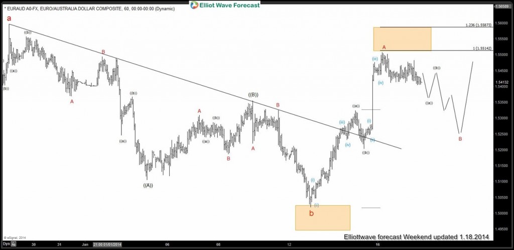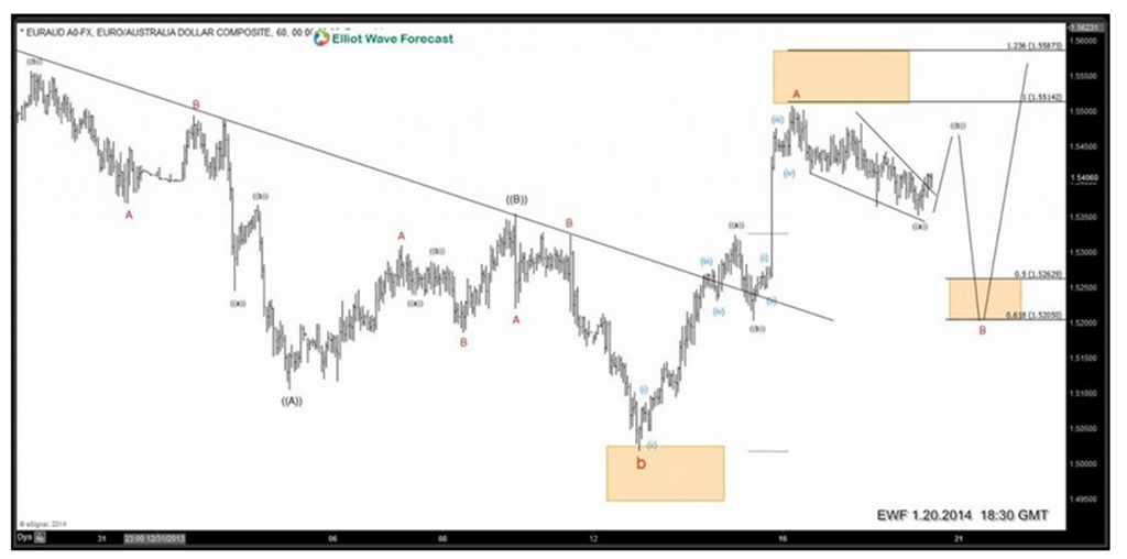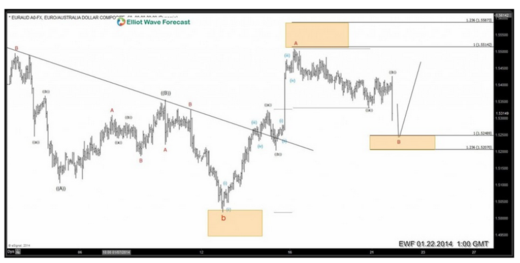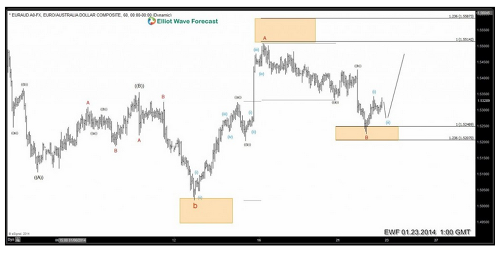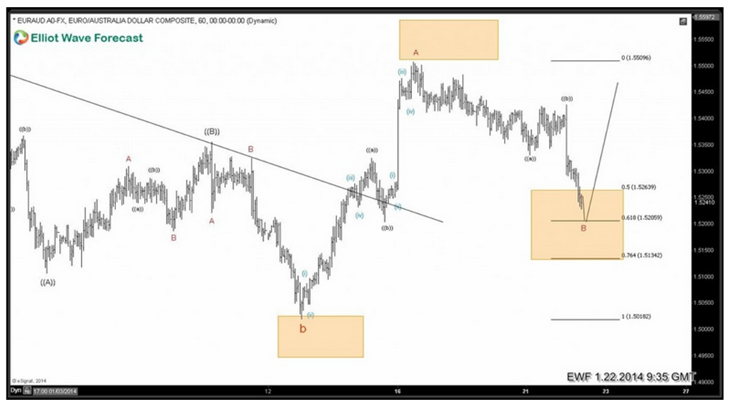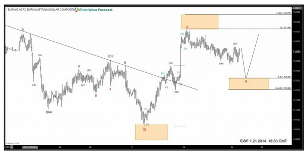 Series of charts from members area showing Elliott wave analysis and different stages of pull back and rally in EURAUD pair.