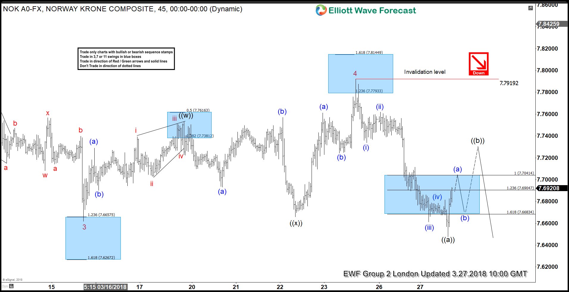 Hello fellow traders. In this technical blog we’re going to take a quick look at the past Elliott Wave charts of USDNOK published in members area of the website. In further text we’re going to explain the short term Elliott Wave view. As our members know, the pair has incomplete bearish sequences in 4 Hour cycle, suggesting further declines. Consequently, we advised clients to avoid buying the pair and expect rallies to fail for more downside.