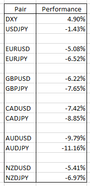 Care to guess what is the best performing major currency in 2018? Chances are you will say that it’s the US Dollar. Although US Dollar is doing pretty well this year, the best performing currency is in fact the Japanese Yen. You can see in the table below that despite the Dollar Index rallying 4.9% as of Dec 27th, the Yen has outperformed the U.S Dollar by 1.43%. We can also see the U.S. Dollar has rallied against all the other major currencies, but the Japanese Yen has rallied even at a greater percentage against the same currency. For example, EURUSD has dropped 5.08%, meaning that U.S Dollar has rallied 5.08% against European Dollar this year. However, EURJPY dropped 6.5%, which means that Japanese Yen has rallied at a greater percentage against the European dollar.