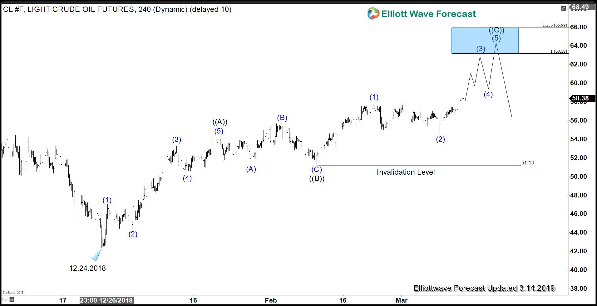 In our previous Chart of The Day on February 28, we suggested that Crude Oil (CL_F) is on the verge of a breakout. It has now confirmed our view as price extends higher and breaks above March 1 high at $57.88. The production output’s curb by the OPEC members as well as the political upheaval in Venezuela have contributed to the strength in Oil. Technical wise, the sequence remains bullish from both Dec 24, 2018 low and Feb 11, 2019 low. In the chart below, we can see a bullish sequence stamp and right side up to clearly show the direction that we prefer.