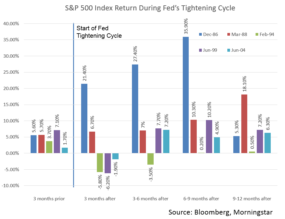 Regardless whether the Fed will hike further or not and how many times, common perception seems to suggest that as interest rate starts to rise, risky assets like equities should see further pressure lower. Observation from the past tightening cycle however suggests it’s not the case, especially at the initial stage of the tightening cycle. Although each tightening cycle is unique and different in a way, historical precedence does have some value when we try to predict the unknown future.
