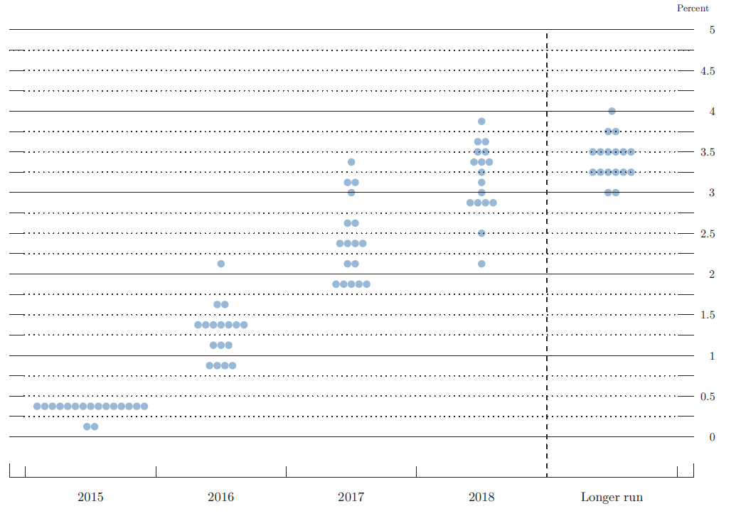 Fast forward to 2016 today, after 7 years of near-zero interest rate policy, the Federal Reserve finally raised the short-term interest rate in December 2015 and thus began the period of tightening cycle. At the last Fed meeting in December, majority of Fed members expect 4 more rate hikes in 2016 (to 1.5% target fed funds rate), as can be seen from the Fed dot plot chart below: