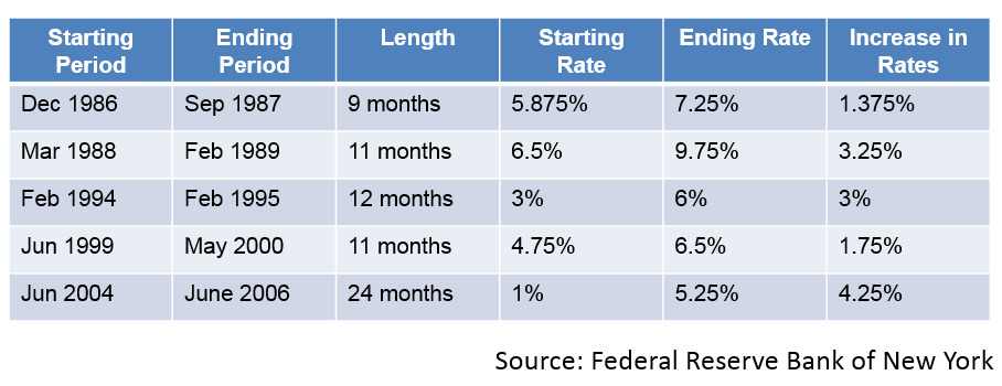 From the table above, with the exception of 2004, duration of the tightening cycle is pretty fast, almost all within 1 year with an average rate increase of 2.7%.