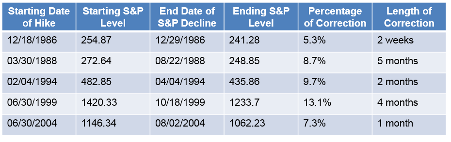 Below we take a look at the 5 previous periods of tightening cycle when the Fed started to raise short term interest rate: