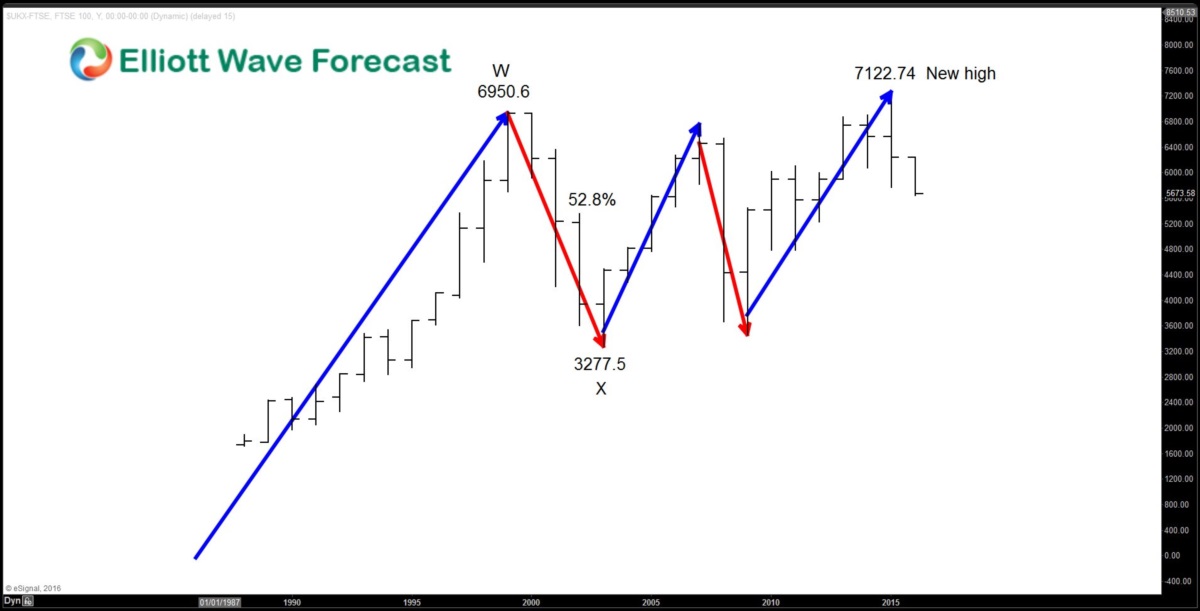 From the chart above, FTSE had the biggest correction from 1999 – 2003, losing 52.8% of its value from the high to the low. From 2003 low, it started a new bullish rally in 3 swing, reaching another high in April 2015. The high in April 2015 is 7122.74, which is an all-time high for the Index. From Elliottwave point of view, this suggests that FTSE remains a buy in the dips against 2003 pivot in the first degree and against the pivot at all time lows in the second degree (in case the Index does a FLAT).
