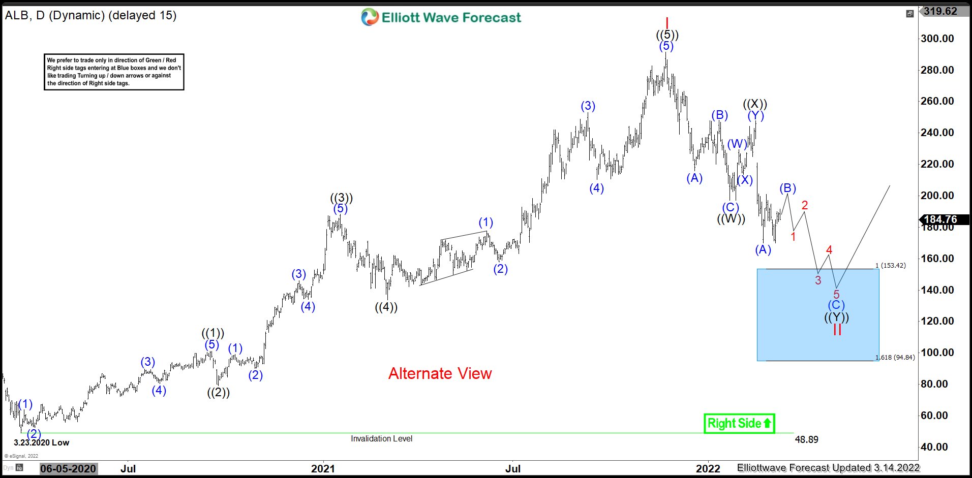 ALB made a short-term low at $48.89 on 3/23/2020. While above there it made ATH at $291.48 within the impulse sequence labelled as I red. Currently, it favors double correction in II & expect to correct lower in between $153.42- $94.84 area before upside resume.