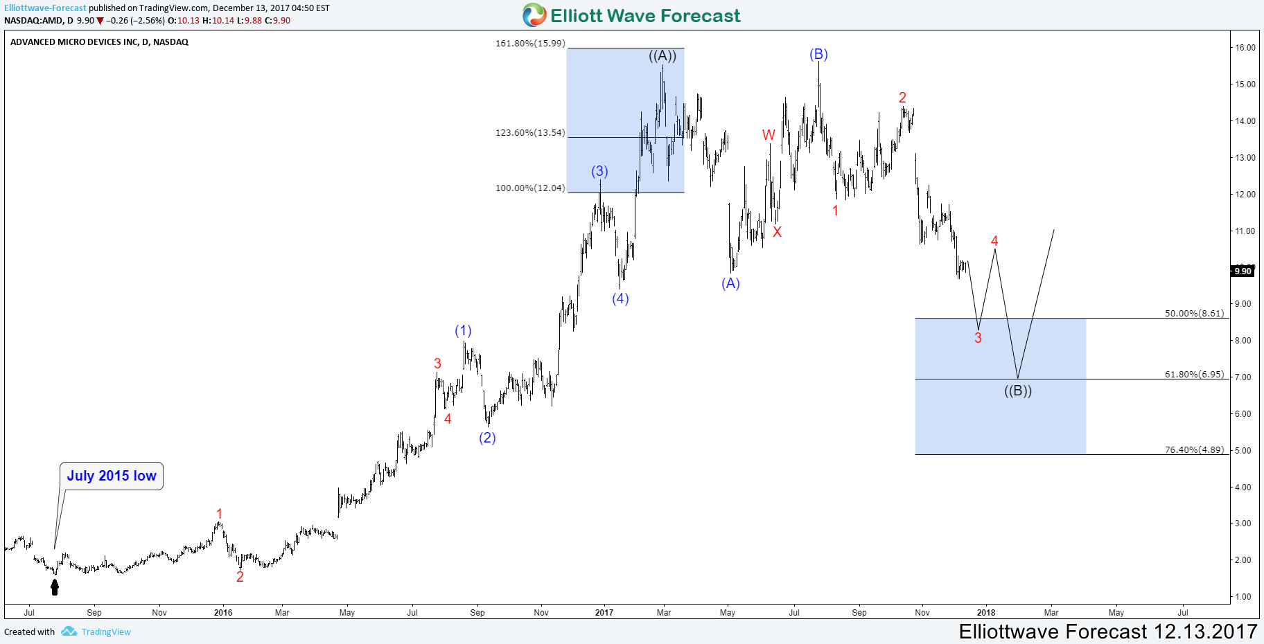 AMD did an impulsive 5 waves from July 2015 low which ended early this year at February peak $15.55. Down from there, the stock is proposed to be doing a 3 waves flat structure to correct the whole cycle and looking to extend lower toward 50% – 76.4% Fibonacci retracement area $8.61 – $4.89. From there, AMD can either resume the rally to new highs or bounce in 3 waves at least.