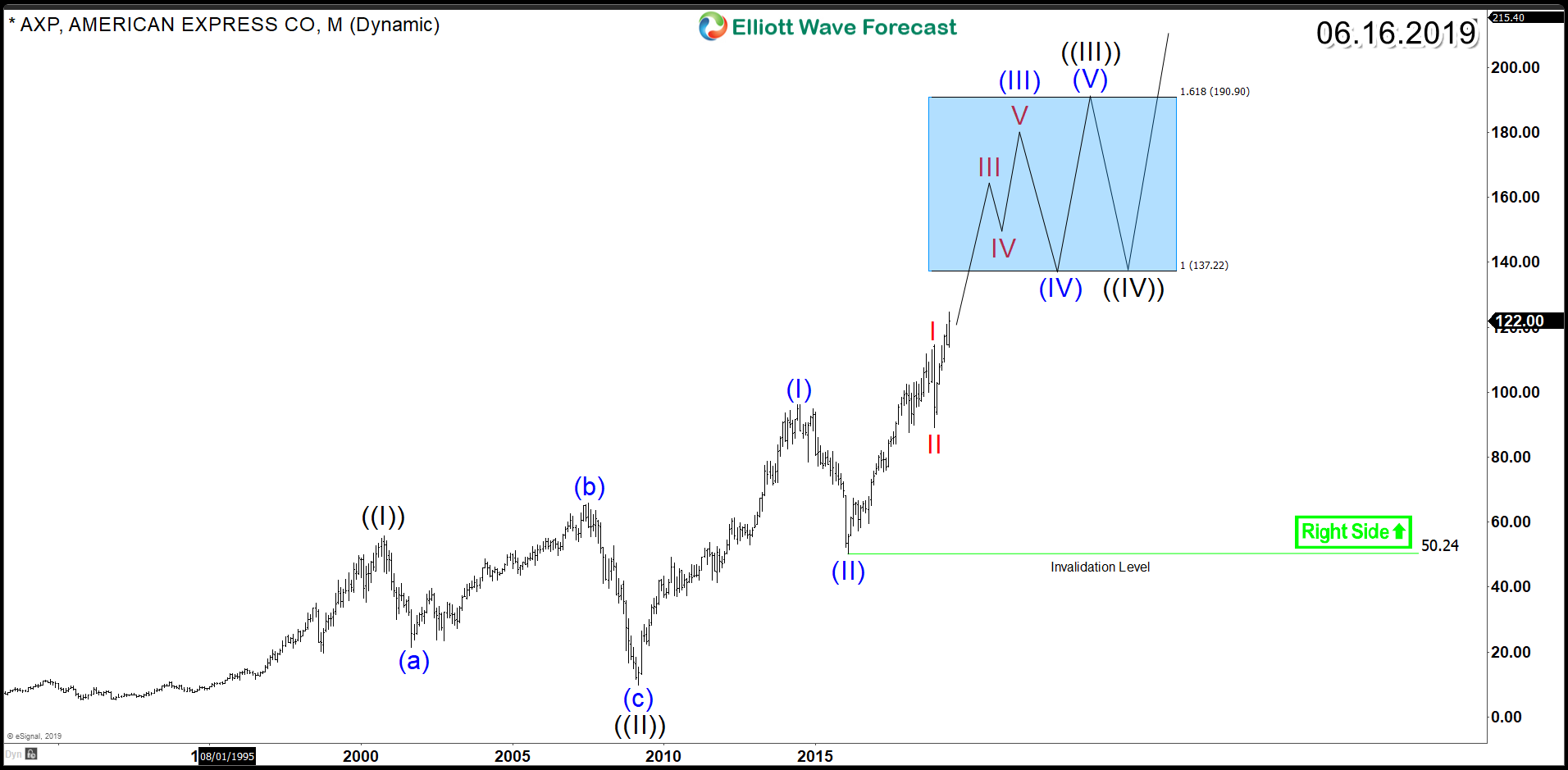 American Express (NYSE: AXP) is an American multinational financial services corporation that was founded in 1850. Since it’s IPO back in the seventies, AXP rallied in an initial Elliott Wave 5 waves impulsive structure which ended in 2000 with the Dot Com Bubble as a wave ((I)). In the following years, the stock did a huge Flat as 3 waves corrective Elliott Wave Structure which ended after the 2008 Financial crises.