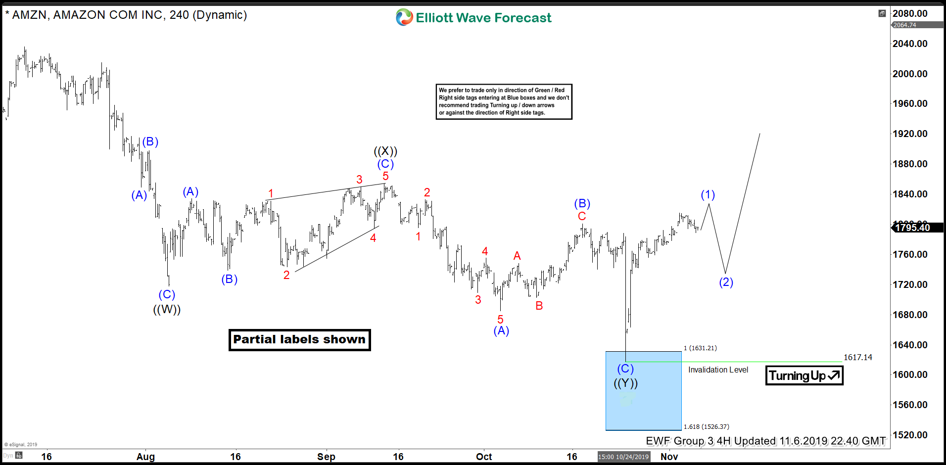 AMZN 4-hour Chart from 10/23/2019 update. In which, the rally from 12/24/2018 low ended 5 waves impulse rally at $2036.31 high seen at 7/11/2019 peak. Down from there, the stock corrected the cycle from 12/24/2018 low and made a pullback. The internals of that pullback unfolded as double three structure with the sub-division of 3-3-3 corrective structure in each leg lower. When initial decline to $1849.44 low ended wave (A), wave (B) bounce ended at $1897.92 high and wave (C) ended at $1718 low thus completed wave ((W)) as zigzag structure.