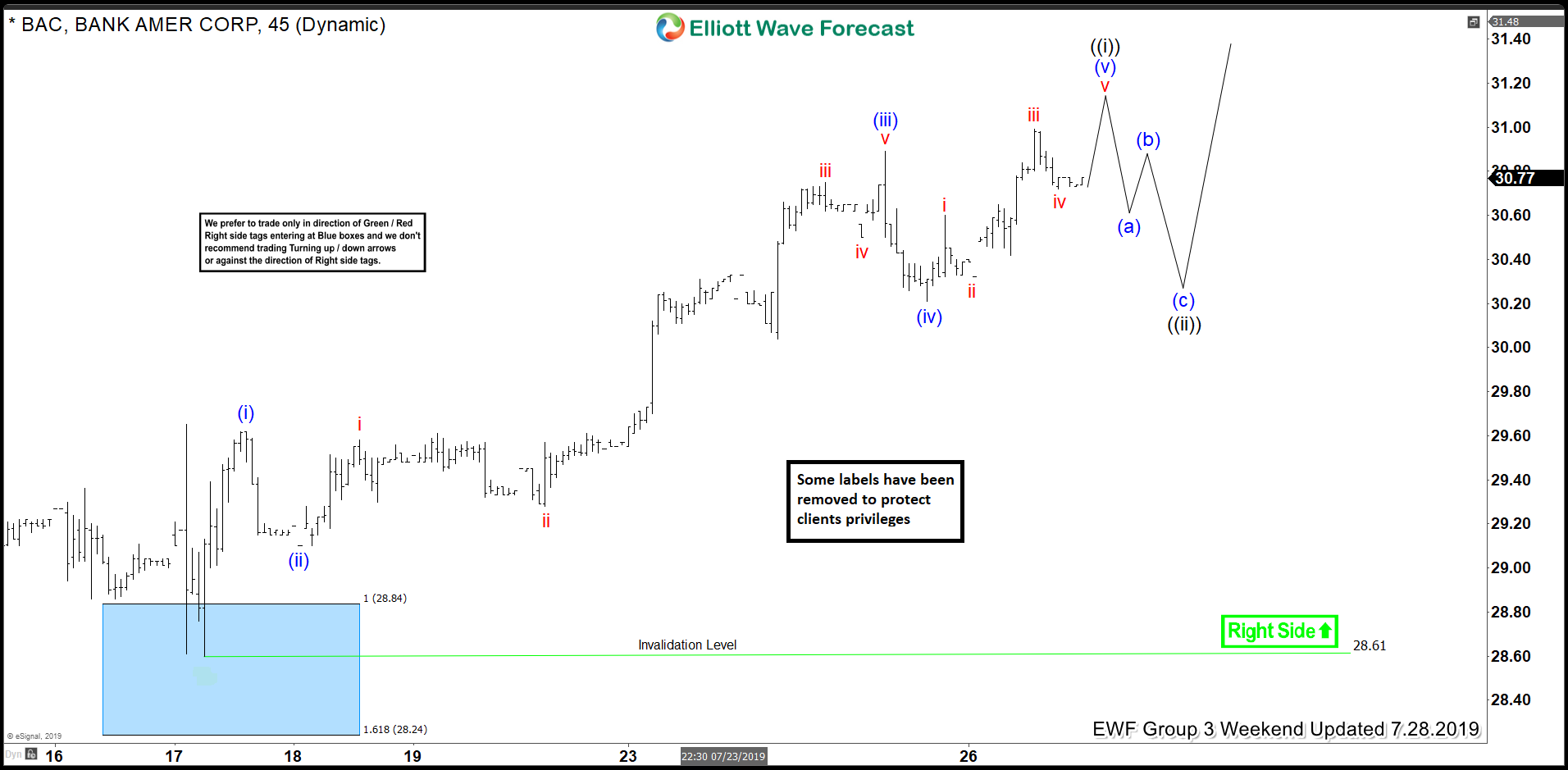 BAC 1 hour Elliott Wave Chart from 14 July Weekend update, in which the stock ended the 5 waves rally from $27.37 low in an impulse structure within wave ((i)) at $29.89 high. Down from there, the stock corrected the rally from $27.37 low in wave ((ii)) pullback. The internals of that pullback unfolded as Elliott Wave Zigzag structure where wave (a) ended in lesser degree 5 waves at $28.93 low. Up from there, wave (b) bounce ended in 7 swings at $29.80 high. And wave (c) was expected to reach $28.84-$28.24 100%-161.8% Fibonacci extension area of (a)-(b). Afterwards, the stock was expected to find buyers at the blue box area looking for more upside into the direction of right side tags.