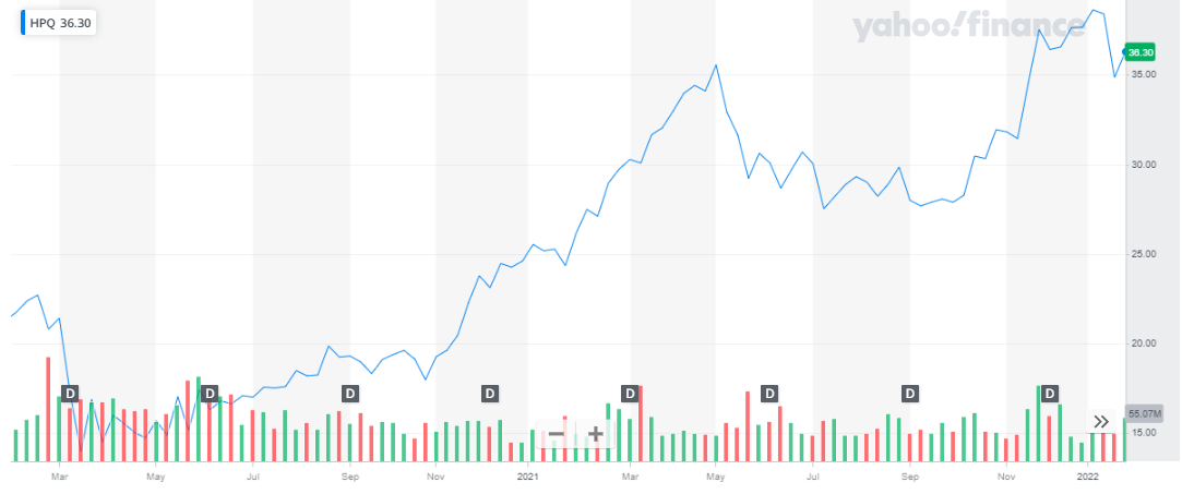 HP has a market valuation of around $39.3 billion. Its share is trading at a price of $36. The stock of the company has shown huge growth in the past two years. From a price of $25.53 at the start of 2021, the price of the HP share was $3767 at the end of 2021.