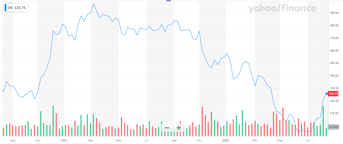 The Walt Disney company has a market capitalization of $ 229.2 billion. Its share is trading at a price of $ 124.26. The majority of 2021 was a very good year in terms of stock performance. The stock peaked at $ 197.16 in March’21 and the stock maintained the price level of above $ 170 for the major part of the year. The stock started off at $ 181.18 and closed the year at $ 154.89. Overall, the stock dropped by 14.5 % during the year.