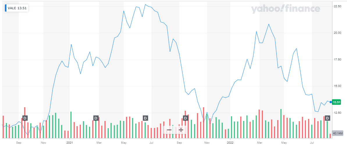 Vale SA has a market capitalization of $ 64.9 billion. The share of the company is currently trading at a price of $ 13.41. The share of Vale SA has exhibited multiple performance cycles in the past two years. The stock of Vale started rising in Nov 2020, During 2021, the stock peaked at $ 22.68 after which it started declining. The stock hit the low of $ 11.45 in Nov 2021. This marks the end of one cycle.