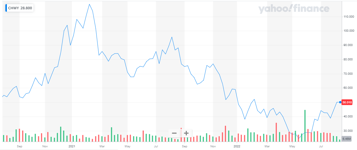 Chewy has a market capitalization of $ 21 billion. Its share is trading at a price of $ 50.01. The stock started in the year 2021 at a price of $ 89.89. It went as high as $ 118.69 in 2021 and then started declining. The stock closed the year at a price of $ 58.97. Overall, the stock declined by 34.4 % in 2021.