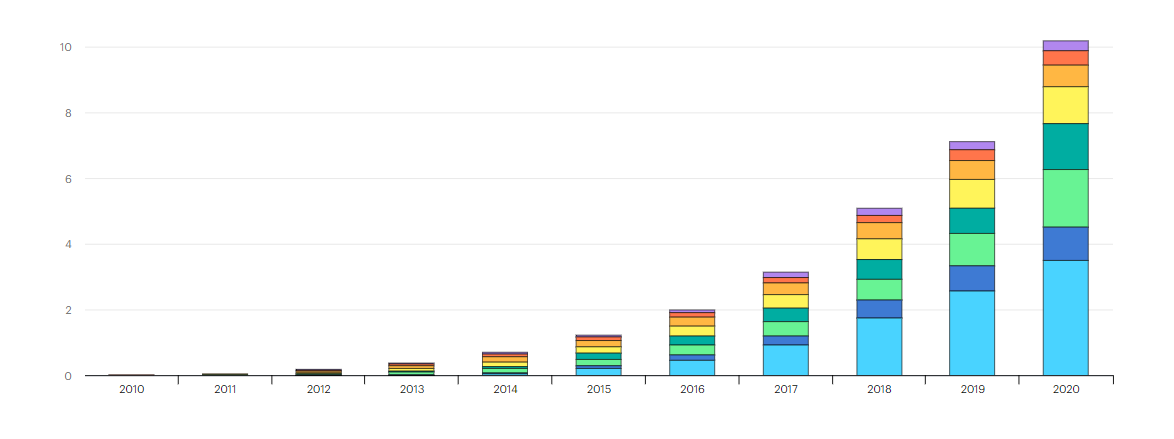 After a decade of rapid growth, in 2020 the global electric car stock hit the 10 million mark, a 43% increase over 2019, as per the report of Global EV Outlook. China, with 4.5 million electric cars, has the largest fleet, though in 2020 Europe had the largest annual increase to reach 3.2 million.