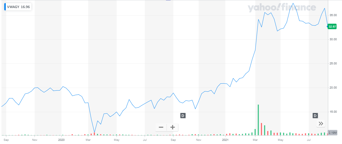 Volkswagen has a market valuation of around $164 billion. The share of the carmaker is currently trading at $32.67.The stock has risen by approx. 57% from the start of the year.