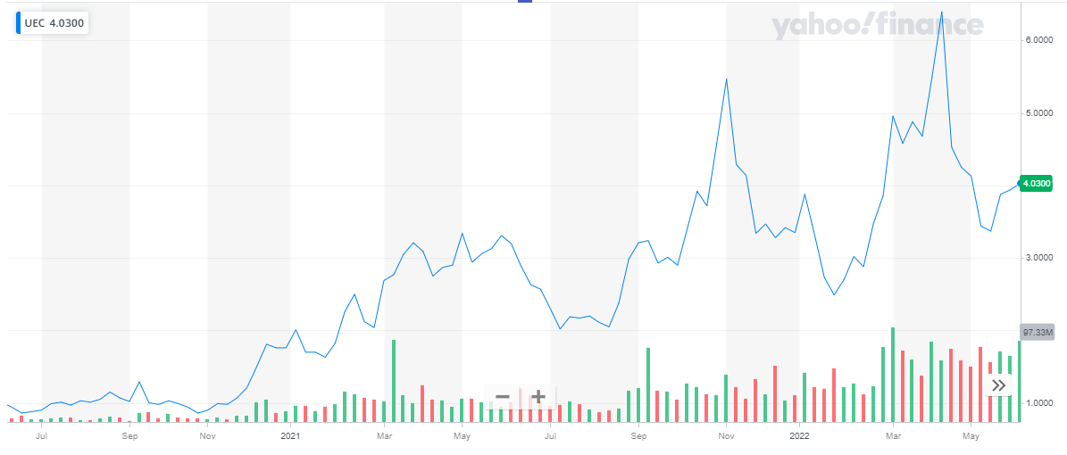 In 2022, the stock peaked ta $ 6.4 before shrinking. During the current year, the UEC stock has appreciated by 20.3 %.