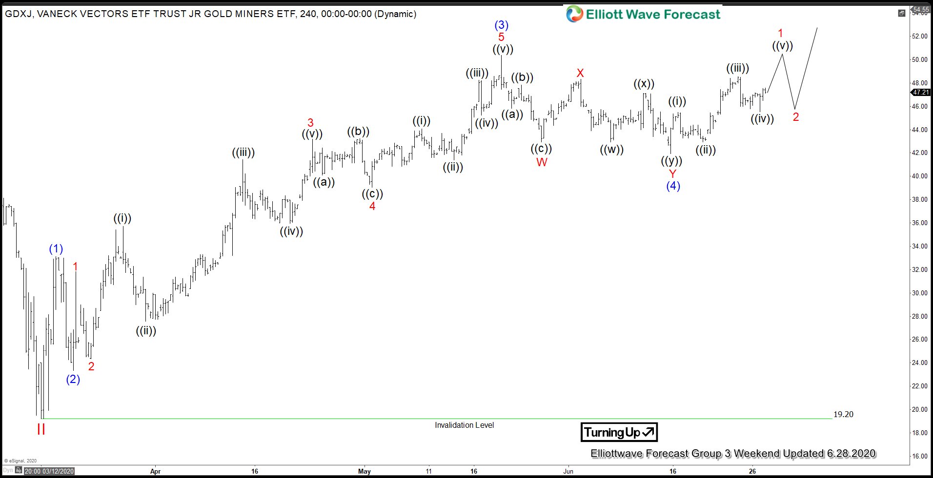 Daily Elliott Wave chart on GDXJ above suggests the pullback to $19.52 ended wave II on March 13, 2020 low. The pullback coincided with the selloff in global indices due to the Covid-19 breakout around the world. Since then however, the ETF has recovered very strongly and currently at the level above the pre-Covid 19 selloff. The ETF should continue to be supported in the dips against the March 2020 low for further upside.