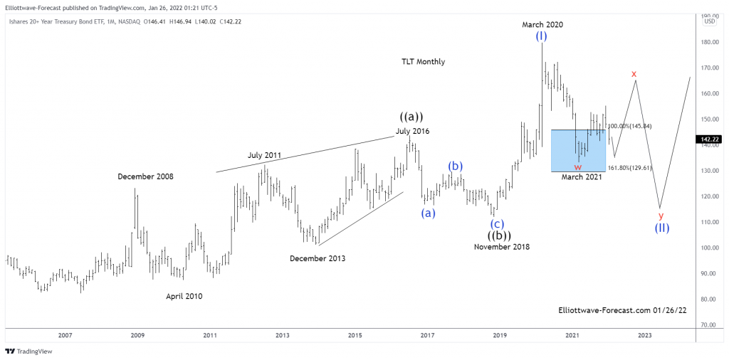 Firstly the ETF fund TLT inception date was on July 22, 2002. This instrument seeks to track the investment results of an index composed of or in U.S. Treasury bonds with maturities twenty years or more remaining. There is a lack of data before July 22, 2002. This article will focus on the larger uptrend cycle from there which is presumed finished a cycle higher from those lows in wave ((a)) in July 2016. The pullback from that high appeared to be an Elliott wave zig zag structure in three waves into the November 2018 wave ((b)) lows.